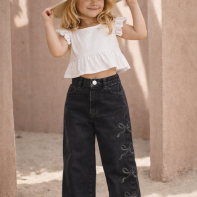 Kız Çocuk Bol Paça Kurdale Desenli Siyah Pantolon