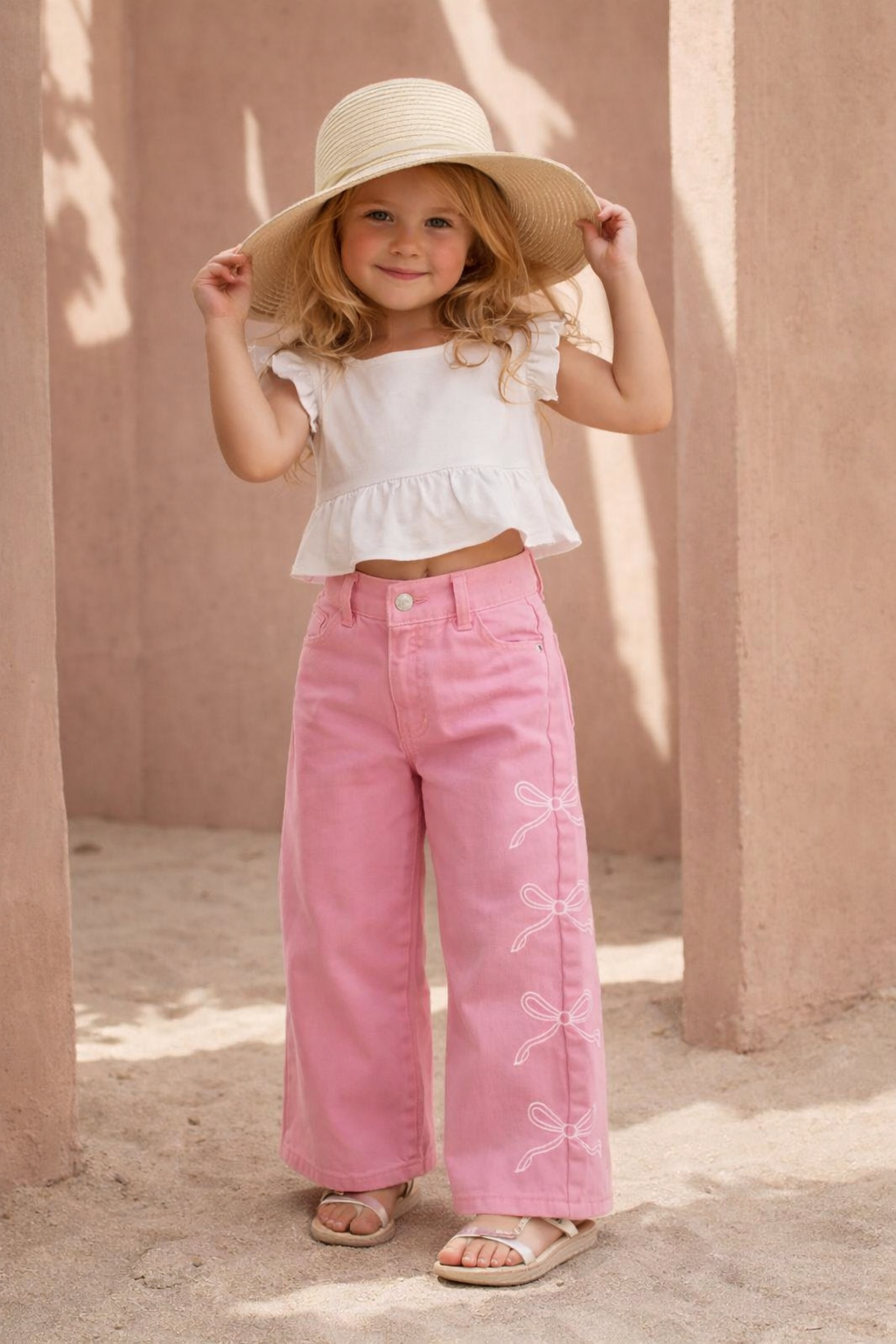 Kız Çocuk Bol Paça Kurdale Desenli Pembe Pantolon